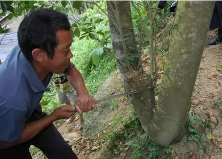 用半斷桿法促使沉香樹(shù)快速結(jié)香的方法,是在離沉香樹(shù)干基部1米以上的樹(shù)干上鋸一個(gè)傷口,傷口的深度約為沉香樹(shù)干直徑的1/3至1/2。沿著沉香樹(shù)干同一個(gè)方向的不同高度,按照以上方法再多鋸幾個(gè)傷口,傷口與傷口之間的間距約為30-40厘米左右,傷口寬度約為1厘米左右。