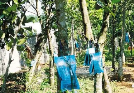 在沉香樹(shù)干的同側(cè)取逆風(fēng)方向,自上而下,大約每隔40-50厘米的地方,按垂直于樹(shù)干的方向開(kāi)一列香門(mén),傷口深度約為樹(shù)干粗的1/3左右,傷口寬約1-2厘米左右,然后用結(jié)香菌種塞滿(mǎn)香門(mén),再用塑料薄膜包扎封口,防止雜菌污染和昆蟲(chóng)、螞蟻為害。